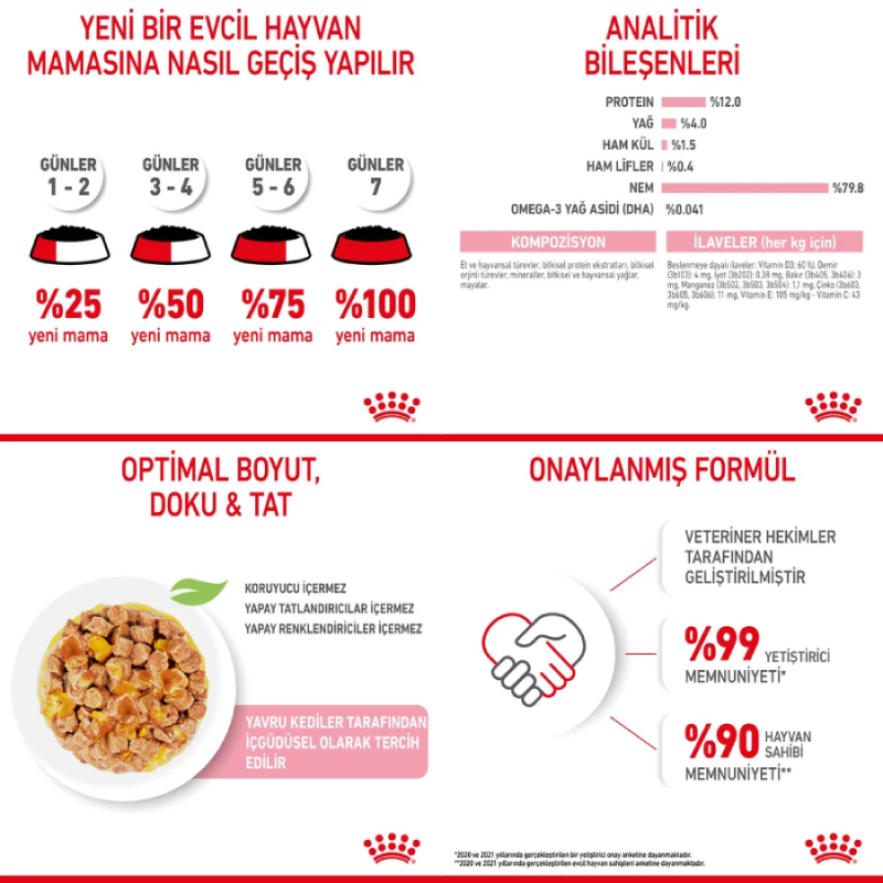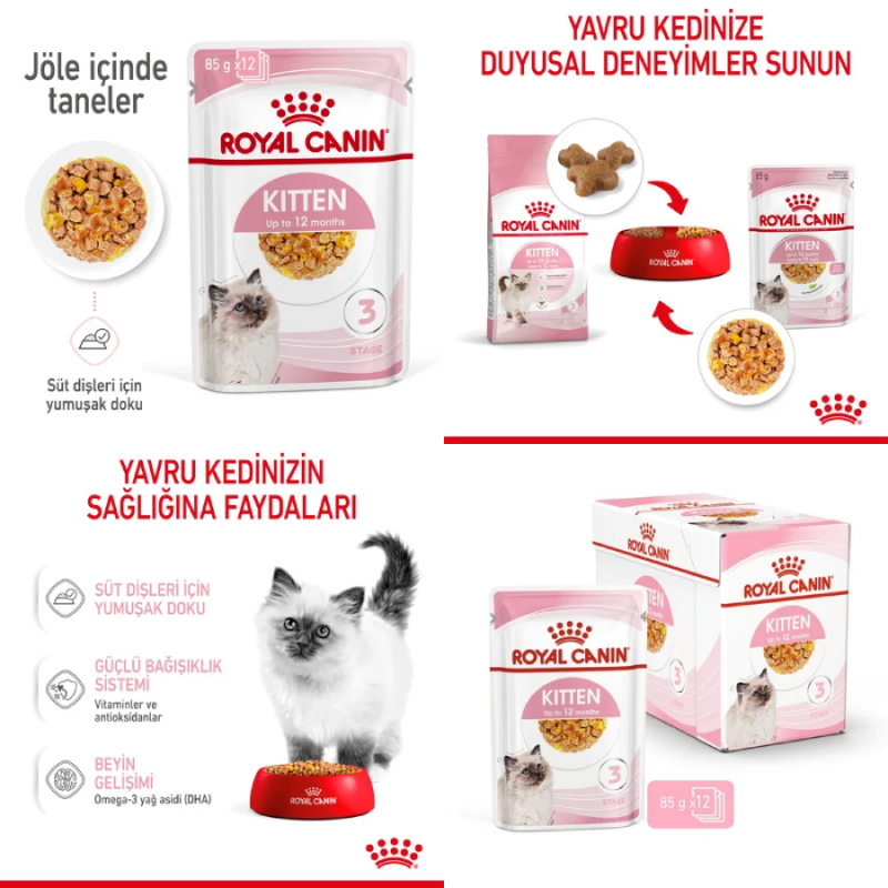 ROYAL CANIN® Kitten Jelly, yavru kedilerin büyümelerinin “konsolidasyon evresinde” beslenme ihtiyaçlarını desteklemek için özel olarak formüle edilmiştir. Bu formül, fiziksel ve davranışsal açıdan önemli değişimler yaşayan 12 aylığa kadar olan yavru kediler için uygundur. Bu özel formülde, büyüme dönemindeki yavru kediler için ideal boyutta, kıvamda ve lezzette jöleli taneler sunulur. Ayrıca, yavru kedilerin sağlıklı bağışıklık sistemi gelişimini desteklemek için Vitamin C ve E gibi besin öğeleri içerir. Bu diyetsel antioksidanların aşılardan sonra daha yüksek ve hızlı antikor artışını harekete geçirdiği kanıtlanmıştır. ROYAL CANIN® Kitten Jelly beyin gelişimini ve göz sağlığını desteklemek için Omega-3 yağ asitleriyle (DHA) takviye edilmiştir. Faydalı prebiyotiklerin (MOS) ve çok yüksek sindirilebilirliği olan proteinlerin birleşimi sayesinde, ROYAL CANIN® Kitten Jelly aynı zamanda sindirim sağlığı açısından bağırsak mikrobiyotasının (bağırsak florası) sağlıklı dengesini desteklemeye yardımcı olur. ROYAL CANIN® Kitten Jelly damak tadına düşkün tüylü dostunuzun zevkine hitap edecek şekilde hazırlandı. Bu yaş mama, yavru kedinize hoş bir duyusal deneyim yaşatır, sağlıklı su alımını destekler ve ROYAL CANIN® Kitten kuru mama diyeti karışık beslenme için mükemmeldir. Yavru kediniz 12 aylık olduğunda, yetişkin bir kedi olarak beslenme ihtiyaçlarını karşılamak için özel olarak uyarlanan bir diyete ihtiyaç duyar. Bu aşamada, yetişkin kediler için sunulan ROYAL CANIN® Fit 32 diyet serisine geçebilirsiniz.
