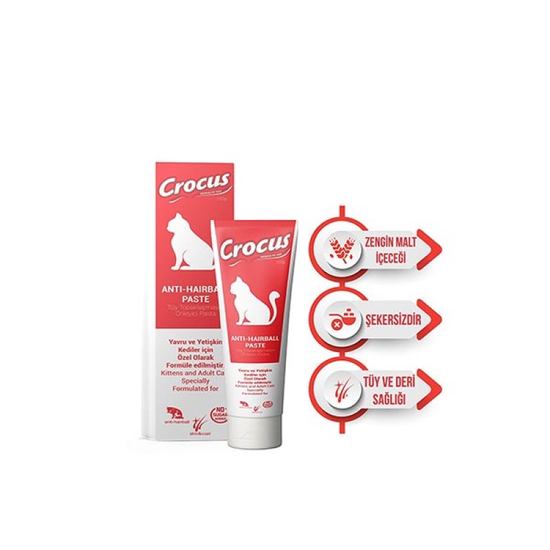 KULLANIM ŞEKLİ: Kediler kendilerini temizlerken vücutlarındaki zayıf tüyleri yutarlar. Yuttukları bu tüyler yumak haline gelir ve mide ve bağırsaklarında tıkanmalara sebep olur. Kediler bu şekilde tüy yumağı problemiyle karşı karşıya kalır ve iştahsızlık, kusma ve sindirim problemleri ortaya çıkar.Tüy yumağı problemiyle karşılaşmamak için bazı ürünleri kullanmak gerekebilir. Crocus Anti-Hairball Malt Macunu oluşan bu tüy yumaklarının sağlıklı ve doğal yollardan atılımını sağlar. Kediniz tüpten direkt olarak rahatça tüketebilir. Yeme şekline göre patisine sürerek veya mamasına karıştırarak verebilirsiniz