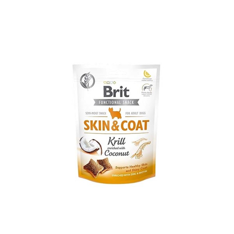 Brit Skin&Coat Karides ve Hindistan Cevizli Tahılsız Köpek Ödülü Tüm köpeklerin sağlıklı beslenmesi için gerekli olan koşullar dikkate alınarak üretilmiş tahılsız, lezzetli ödüldür . Fonksiyonel yarı yumuşak tedaviler, her köpeğin düzenli diyetine sağlıklı, etli ve lezzetli bir takviyedir. Laktobasiller, fulvik asitler ve şeker kavun özü gibi fonksiyonel bileşenlerle zenginleştirilmiştir. Krill, hindistancevizi ile zenginleştirilmiştir. Sağlıklı deri ve tüy yapısı üzerinde olumlu etkisi olacaktır. İçeriğindeki çinko ve biyotin deri ve tüy sağlığını destekler. Tahıl ve patates vb tahıl ürünleri yoktur. Fulvik asitler besin maddelerinin emilmesine yardımcı olur. Antioksidan kaynağı olarak kavun özü Kollajen kas-iskelet sisteminin yenilenmesine yardımcı olur. Tyndalize laktobasiller sağlıklı bir bağırsak mikroflorasının korunmasına yardımcı olur. Hindistan cevizi, daha sağlıklı ve nemli cildin korunmasına yardımcı olan belirli besinler açısından zengin sağlıklı bir besindir. Hindistancevizi normal beslenmeye dahil etmek, köpeğe sağlıklı deri ve tüy yapısı oluşturmada basit ve doğal bir yoldur. Kril,Kuru cildi yenilemek ve beslemek ve sağlıklı deri ve tüylerin oluşmasını teşvik etmek için zengin E vitamini ve omega-3 yağ asitleri kaynağı.